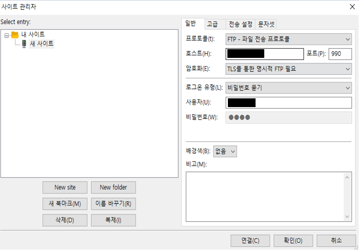 새 사이트 관리자에서 SFTP프로토콜을 적용 후 22 포트를 사용